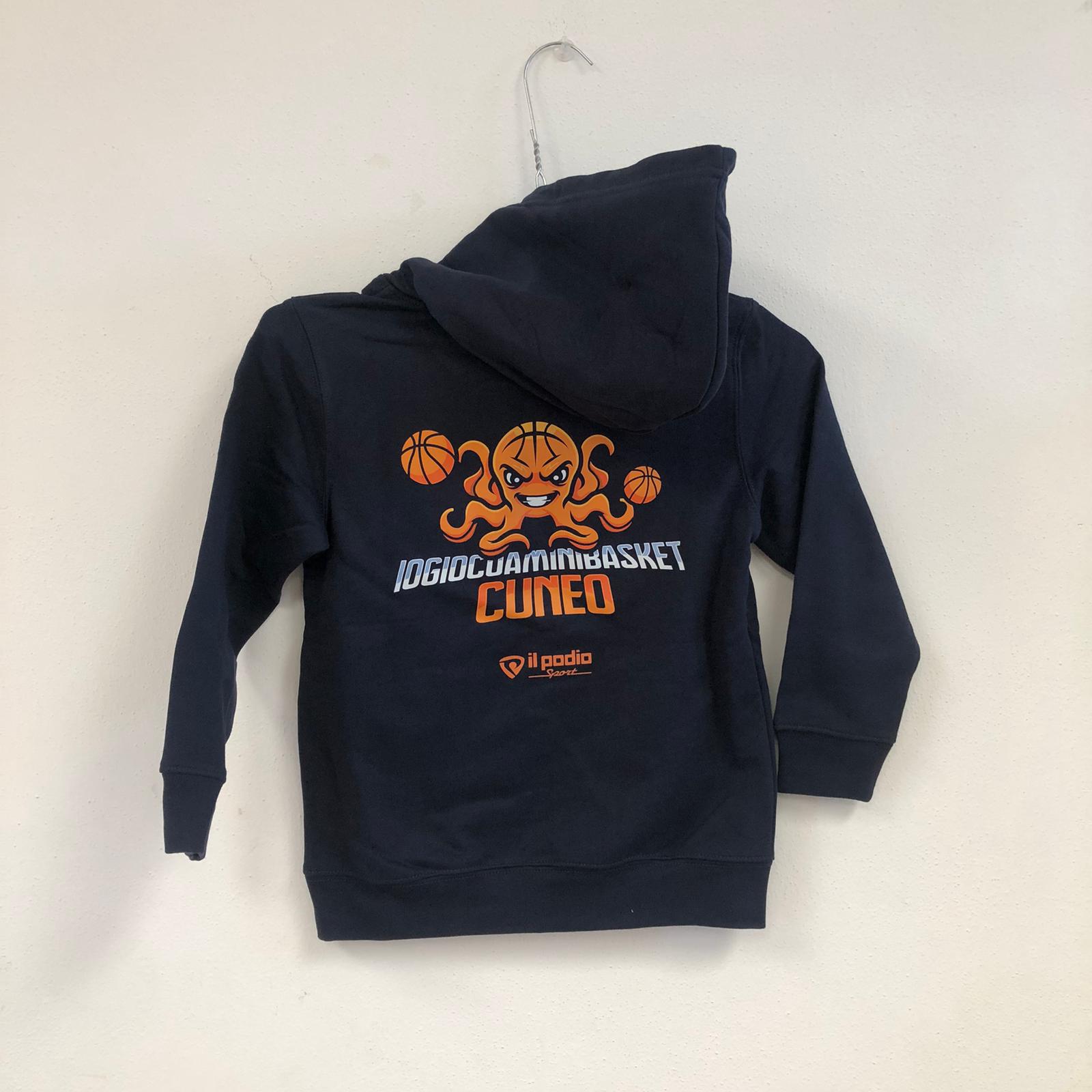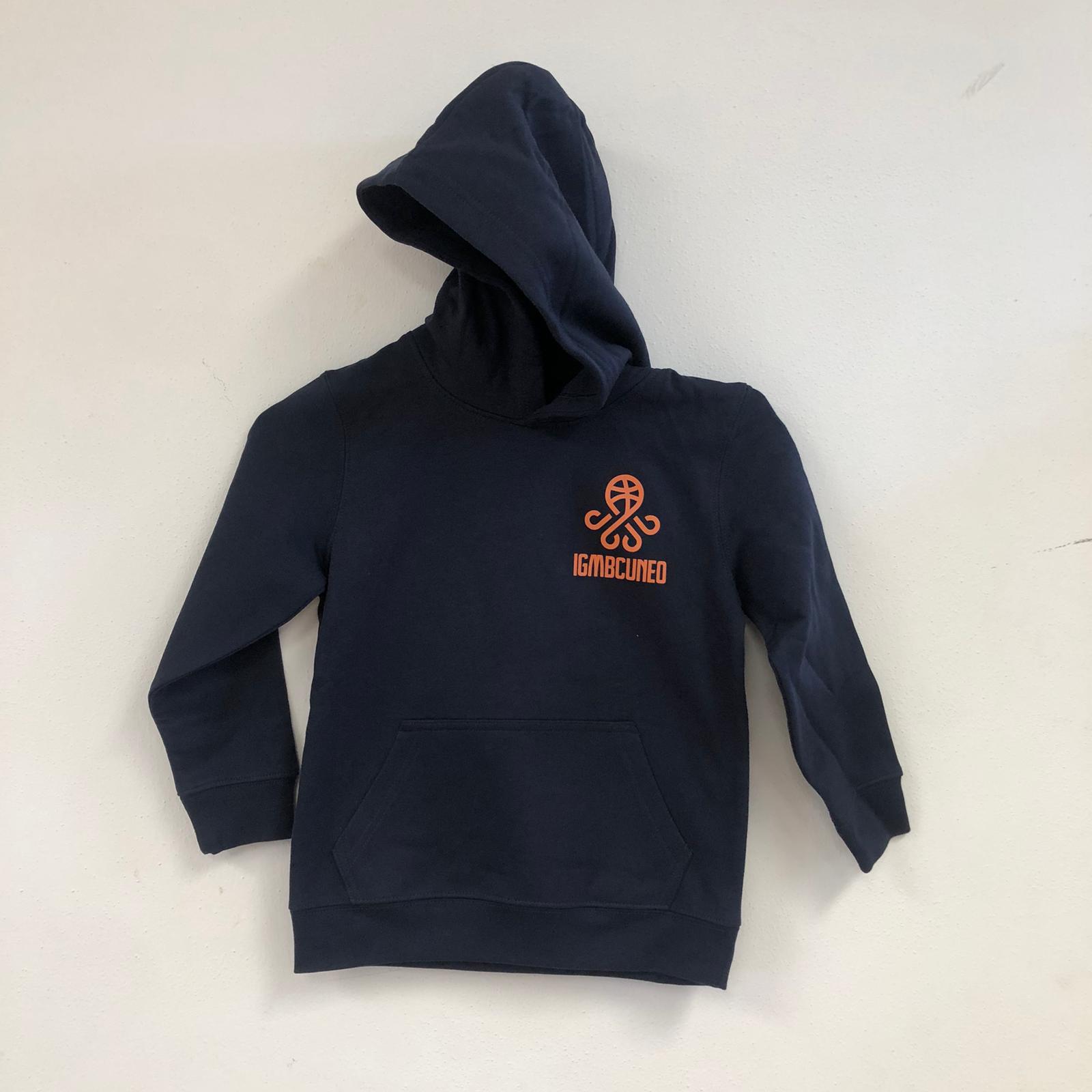 Felpa blu navy con cappuccio Unisex, cotone + poliestere. Polsini, collo e orlo inferiore in costina. Felpata internamente. Stampa logo OCTO stilizzato frontale lato cuore e logo IGMB sul retro.